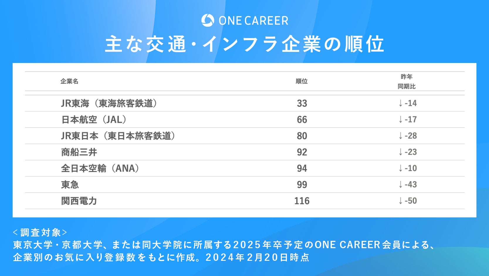 コンサルティングファームや金融機関とは対照的に、軒並みランクダウンしたのがいわゆる「インフラ企業」です。公共交通機関や海運、電力など私たちの生活に欠かせないサービスを提供している企業の順位が、昨年より下がっている傾向にあります。