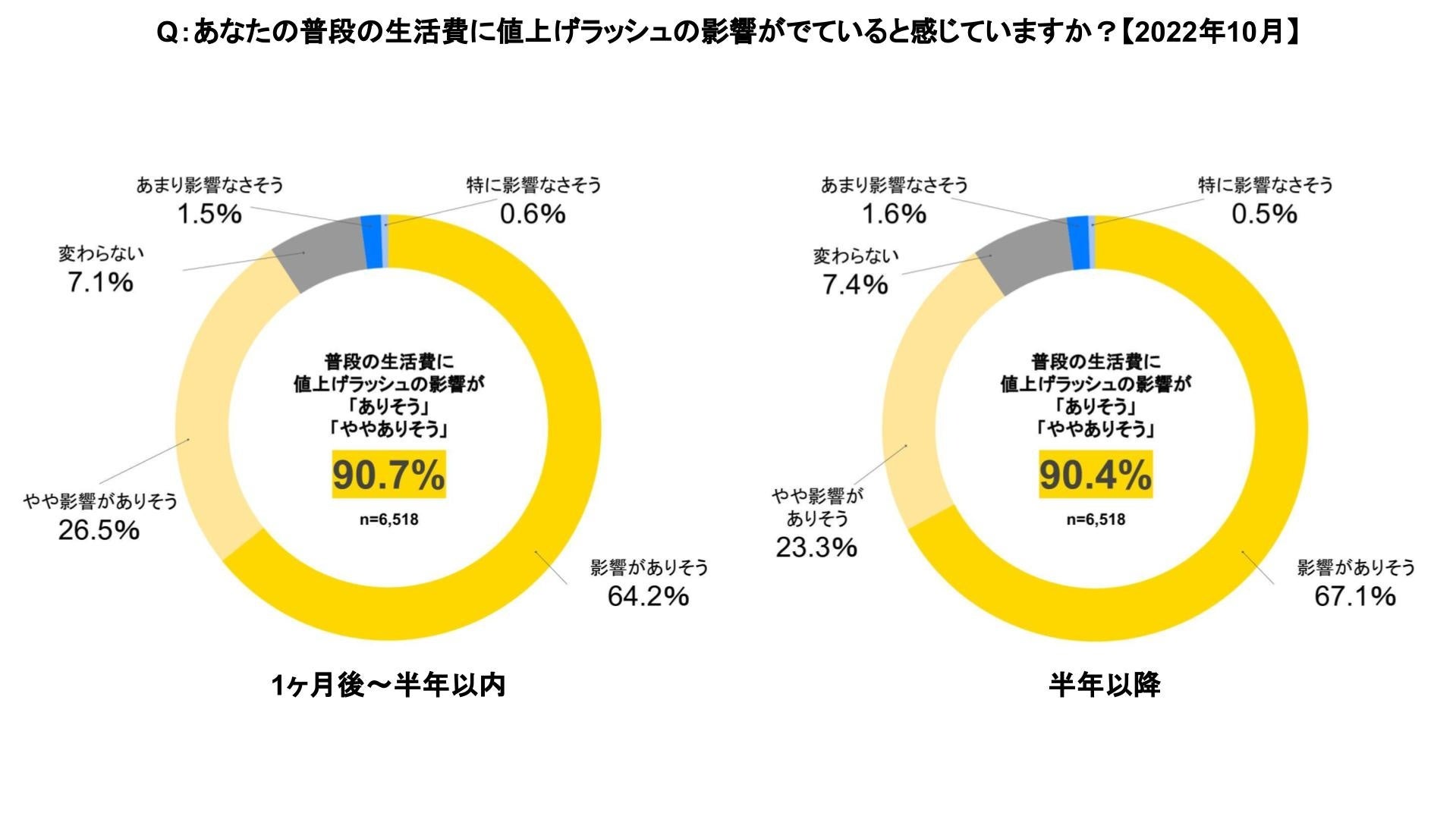 さらに、「1ヶ月後〜半年以内」、「半年以降」に値上げラッシュの影響がある・ありそうと回答した人は9割以上にのぼり、依然として不透明な先行きに不安を感じている人が多くいることが判明した。