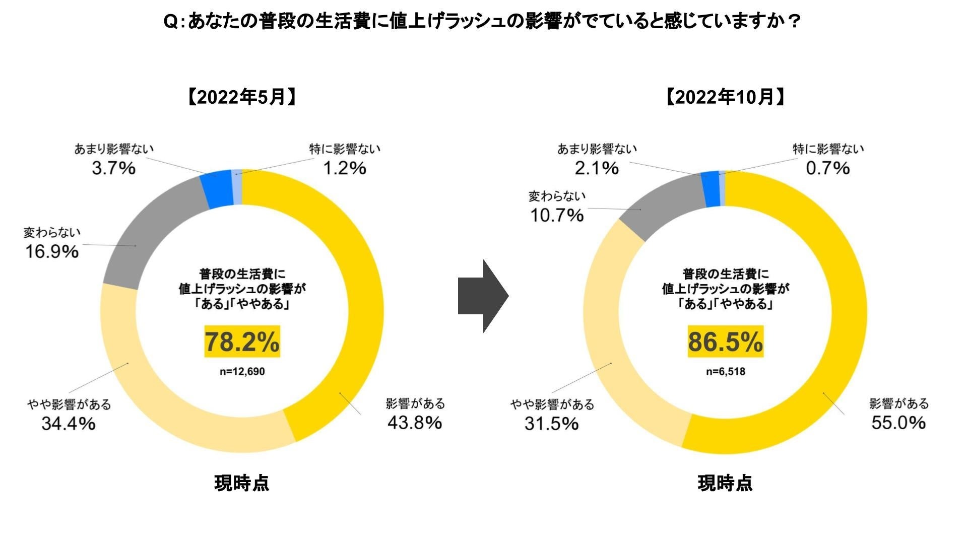 現在値上げの影響を感じている人は86.5%と、2022年5月の調査結果から8.3ポイント増加。