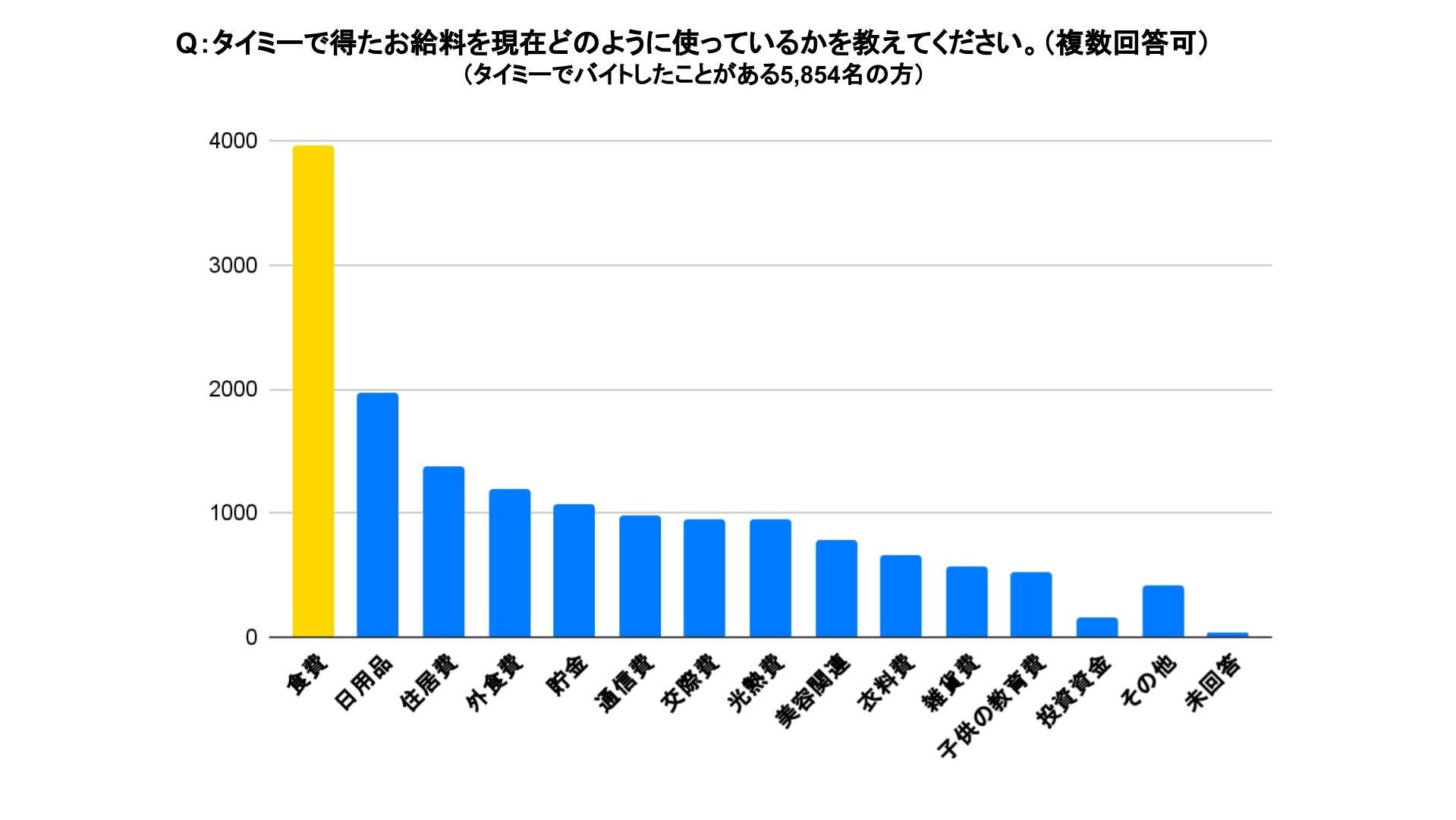 タイミーで得た収入の使い道は、「食費」が最も多く、次いで日用品、住居費など生活費に充てている人が多いことがわかった。