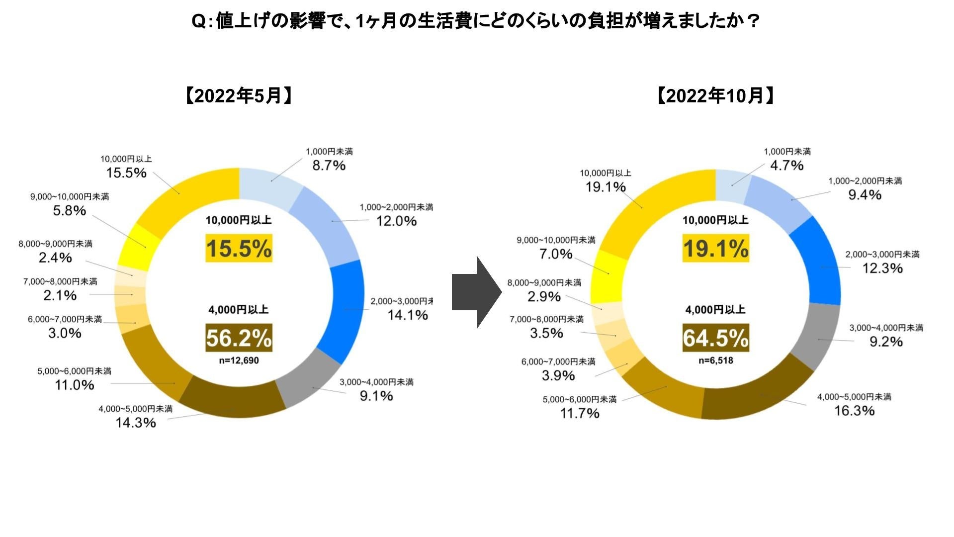 さらに4,000円以上負担が増えたと回答した人が、2022年5月は56.2%であったのに対して、今回の調査結果では、64.5%と8.3ポイント増加。相次ぐ値上げの影響により、家計への負担が増えていることがうかがえる。