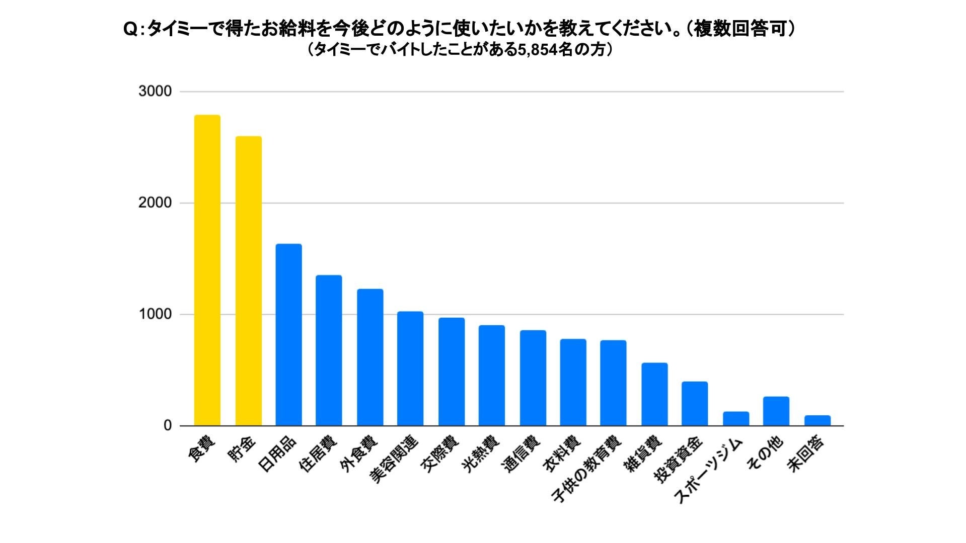 さらに、「タイミーで得た収入を今後どのように使いたいか」という設問に対しては、「食費」と回答した人が最も多く、次いで「貯金」と回答した人が多かった。