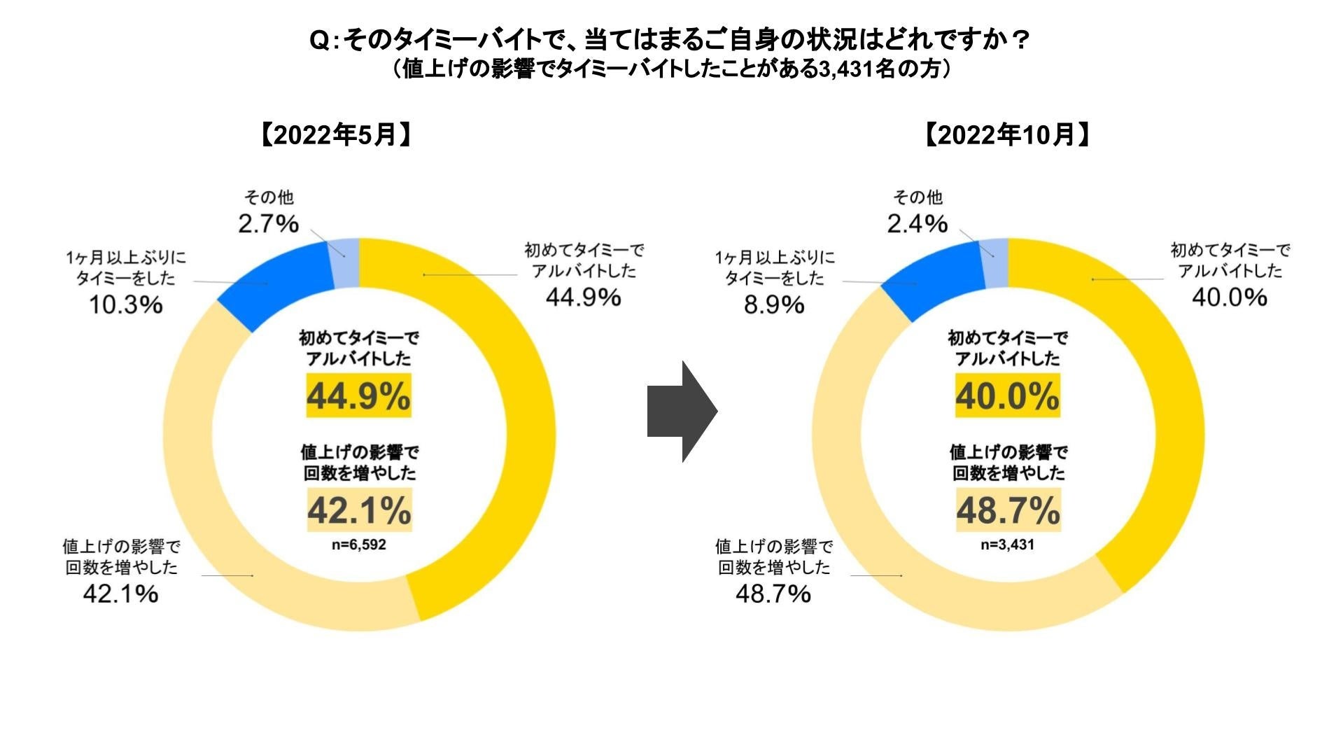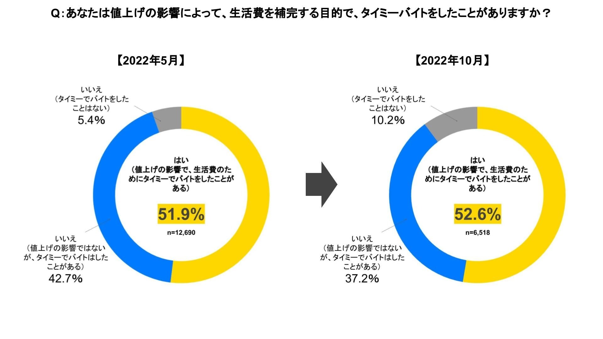 スキマバイトサービス「タイミー」を提供する株式会社タイミー(所在地:東京都豊島区、代表取締役:小川 嶺)は、「タイミー」に登録している働き手6,518名を対象に、2022年中に世間から注目を集めた「秋の値上げラッシュ」と「スキマバイト」に関する実態調査を実施いたしました。2022年5月にも同様の調査を実施し、今回は第2弾となります。