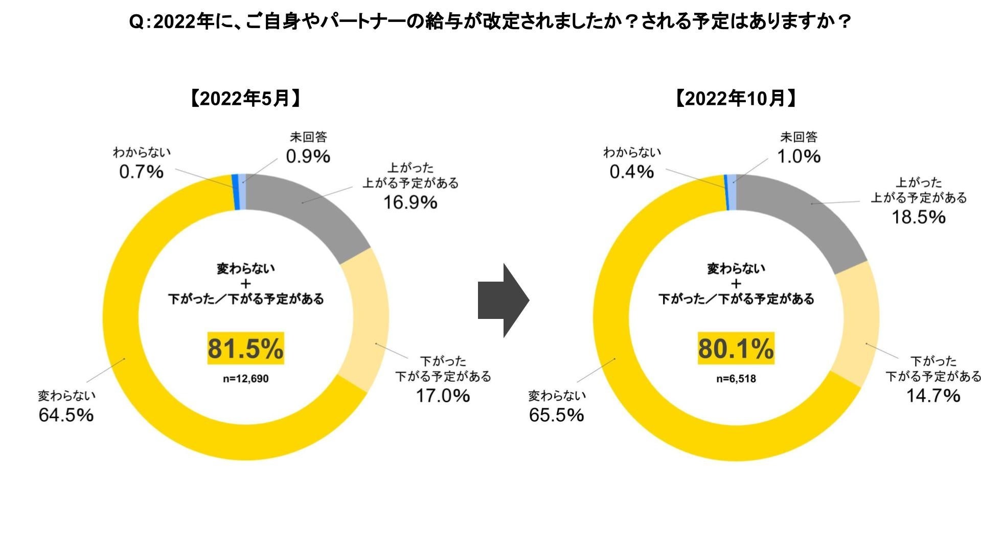 2022年5月と比較すると、今回の調査では「収入が上がった/上がる予定がある」と回答した人は微増したものの、「変わらない」「下がった/下がる予定がある」と回答した人は、8割以上おり、依然として収入が増加していない現状が判明した。