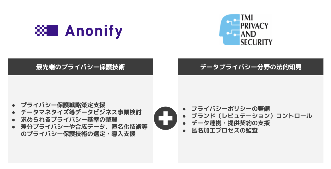 また、これから新たにデータ連携・提供に取り組むお客様においては、LayerXにおいて、データビジネス事業検討およびその際のプライバシー保護基準の整理が可能です。TMI P&Sにおいて、プライバシーポリシーの整備や、データ連携・提供契約の支援を行った上で、それらを満たす上で具体的に必要となるプライバシー保護技術をLayerXが選定してAnonifyの導入支援を行うことによって、戦略〜実装まで一貫した備えを整えることが可能となります。
