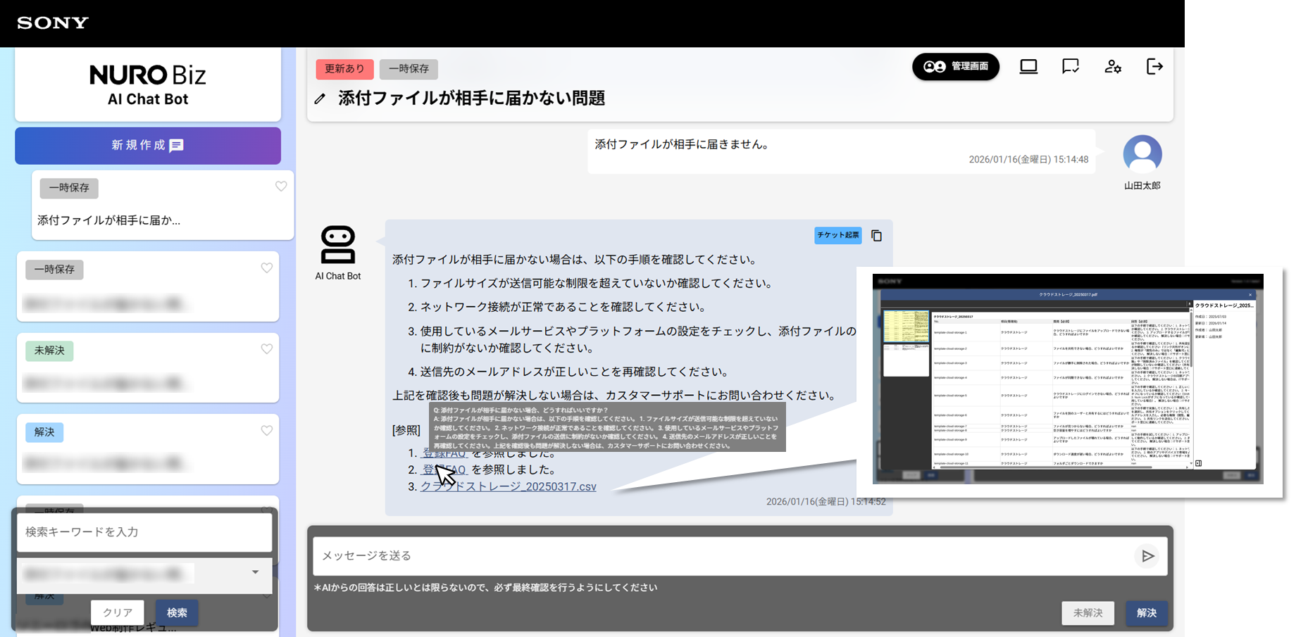 AIによるハルシネーション対策として、回答時に参照したドキュメントや登録FAQをユーザーが簡単に確認できるようになりました。