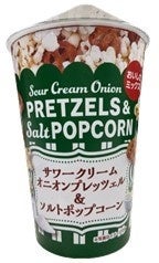 商品特徴:サワークリームオニオン味のプレッツェルとソルト味のポップコーンの組み合わせ。おつまみにも最適な贅沢2種ミックス。