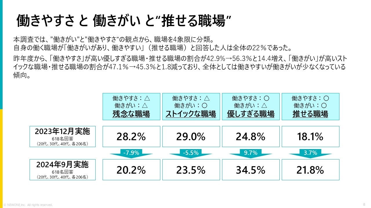 当社にて2023年12月に実施した「“推せる職場”に関する定量調査」では、自分が働く職場を「働きがいを感じ、働きやすい職場」と回答した方は全体の18%という結果で、様々な反響がありました。