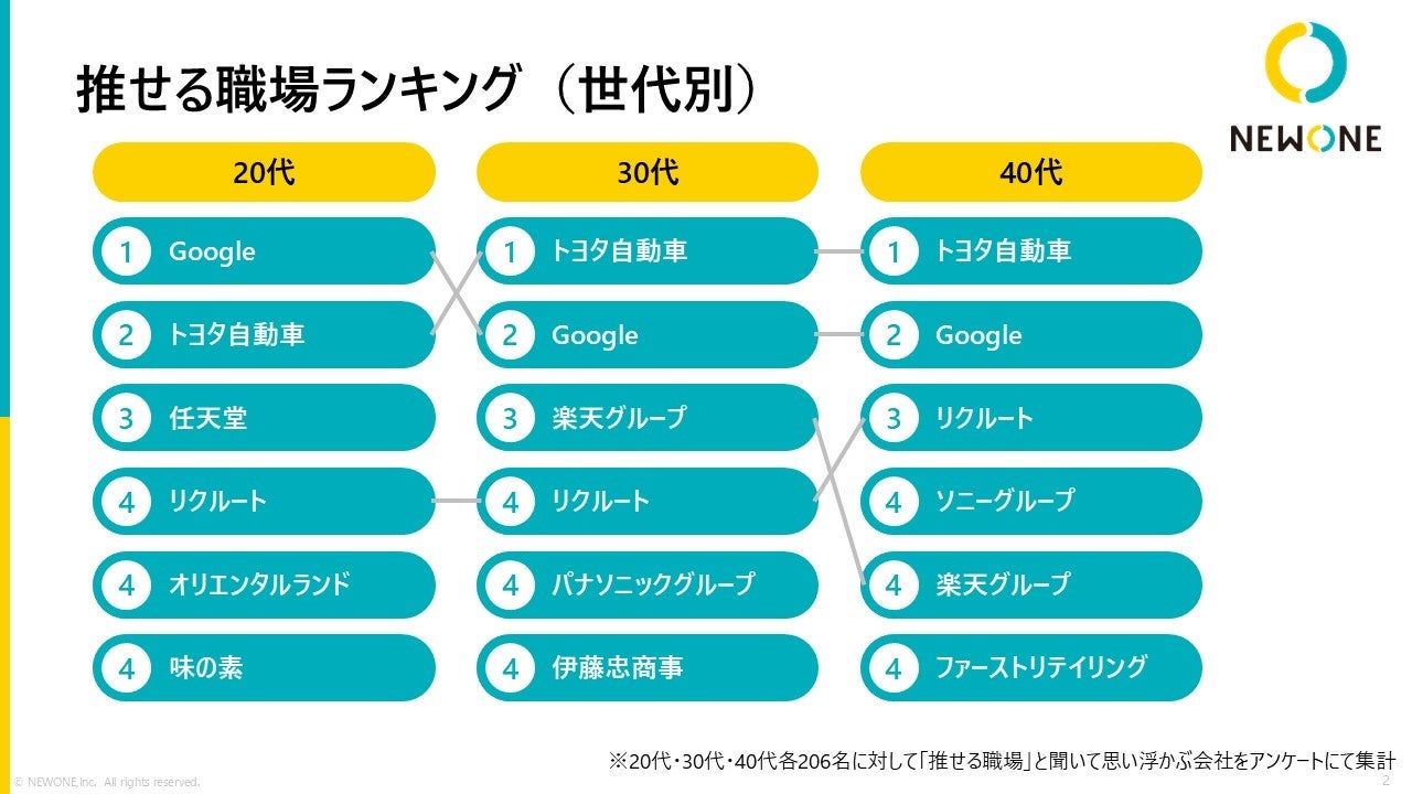 2 推せる職場と聞いて思いつくランキングは、トヨタ自動車、Google、リクルート、楽天グループが上位。