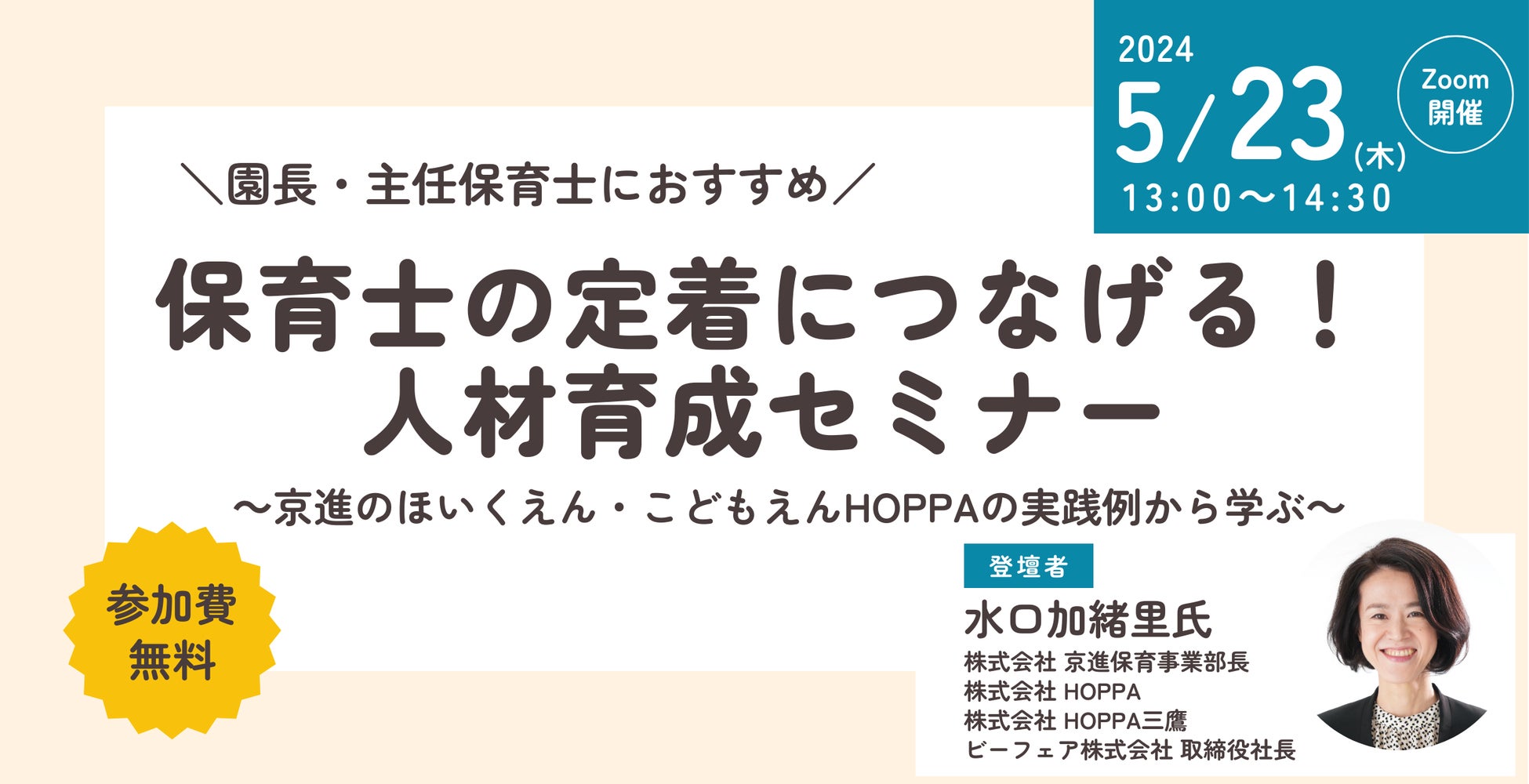 本セミナーでは、95の保育施設を経営している株式会社京進の保育事業部長 水口加緒里氏にご登壇いただき、具体的に取り組まれている人材育成事例についてお話をしていただきます。