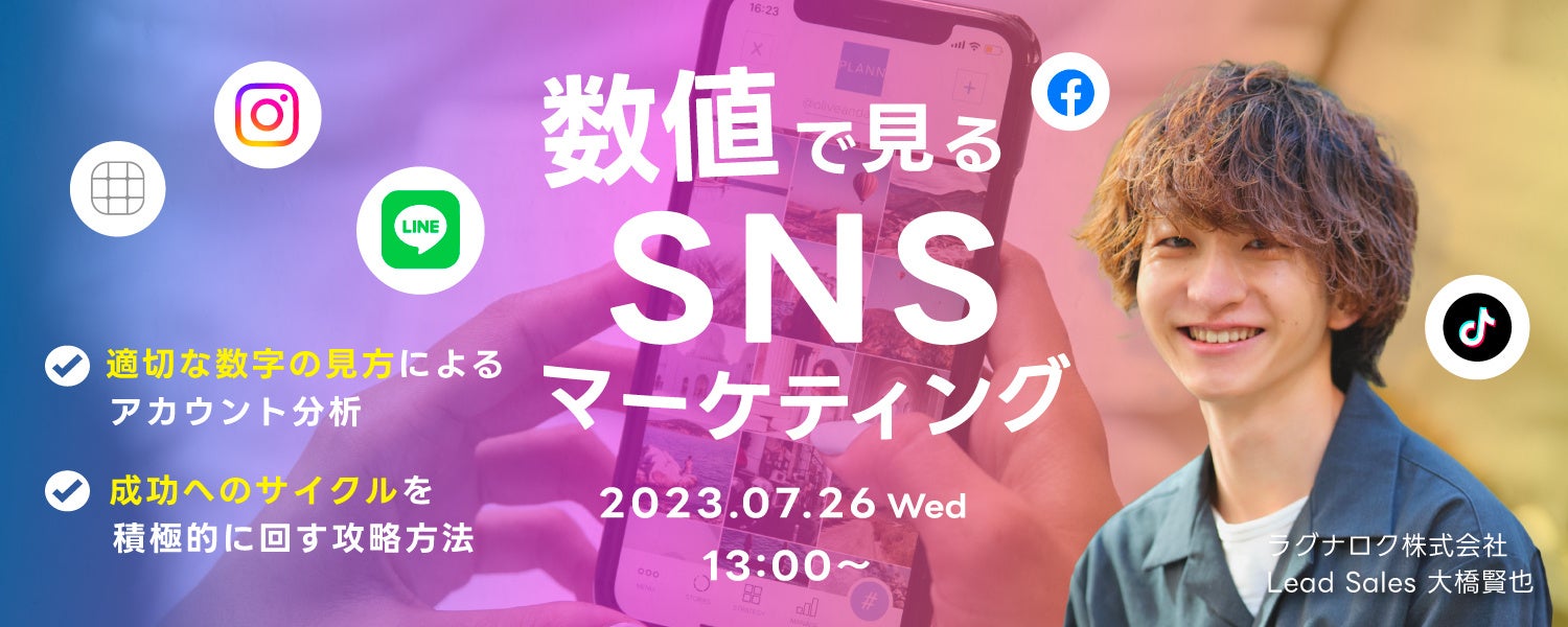 ラグナロク株式会社(本社:東京都渋谷区、代表取締役:西本 誠)は、7月26日(水)13:00より「SNS担当者、マーケティング担当者、代理店の営業担当者」に向けた無料オンラインセミナーを開催することをお知らせします。