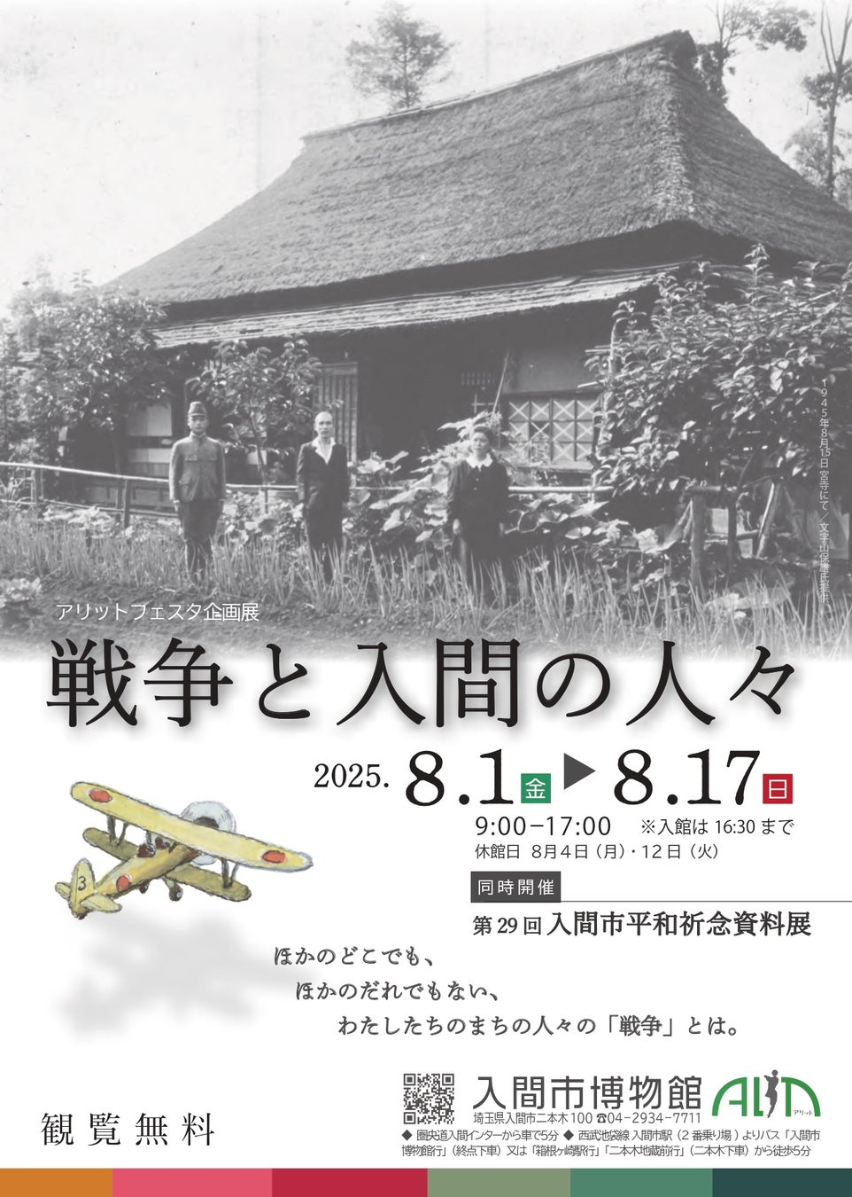 入間市博物館ALITは、アリットフェスタ企画展「戦争と入間の人々」を開催しています 。この企画展では、入間市の人々がのこした日記、手紙、出征兵士に関する記録など多数の資料を通じて、人々の日常の中にあった「戦争」の具体的な姿を振り返ります 。