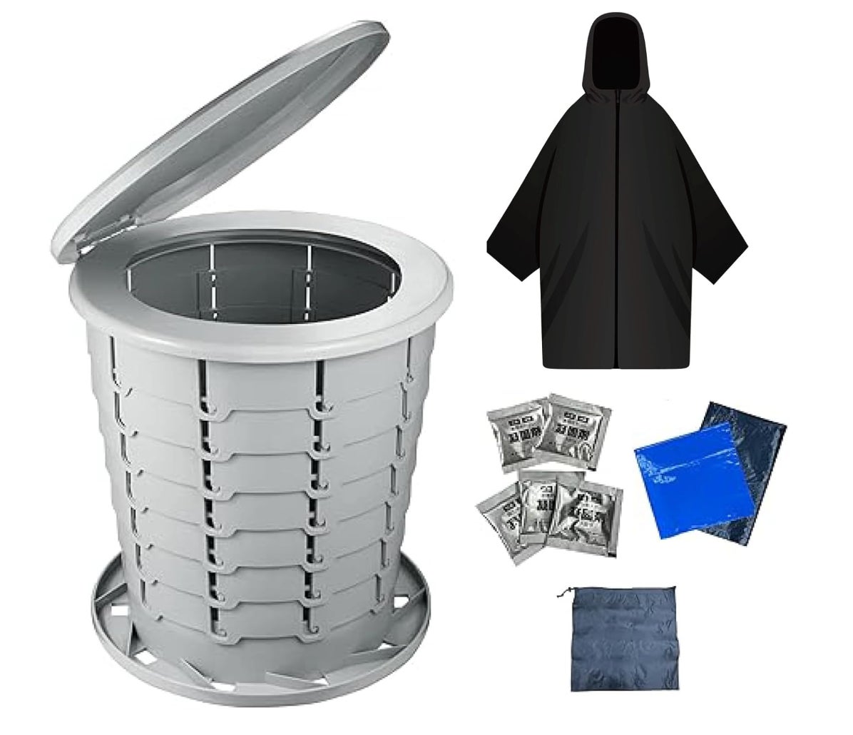 車でも使える!7段階の高さ調節ができる災害用簡易トイレ。渋滞やキャンプ、車中泊でも活躍! 汚物袋、防臭袋、凝固剤だけではなく、目隠し用のポンチョ、更には折りたたんだトイレ本体を収納できる収納袋まで揃えました!