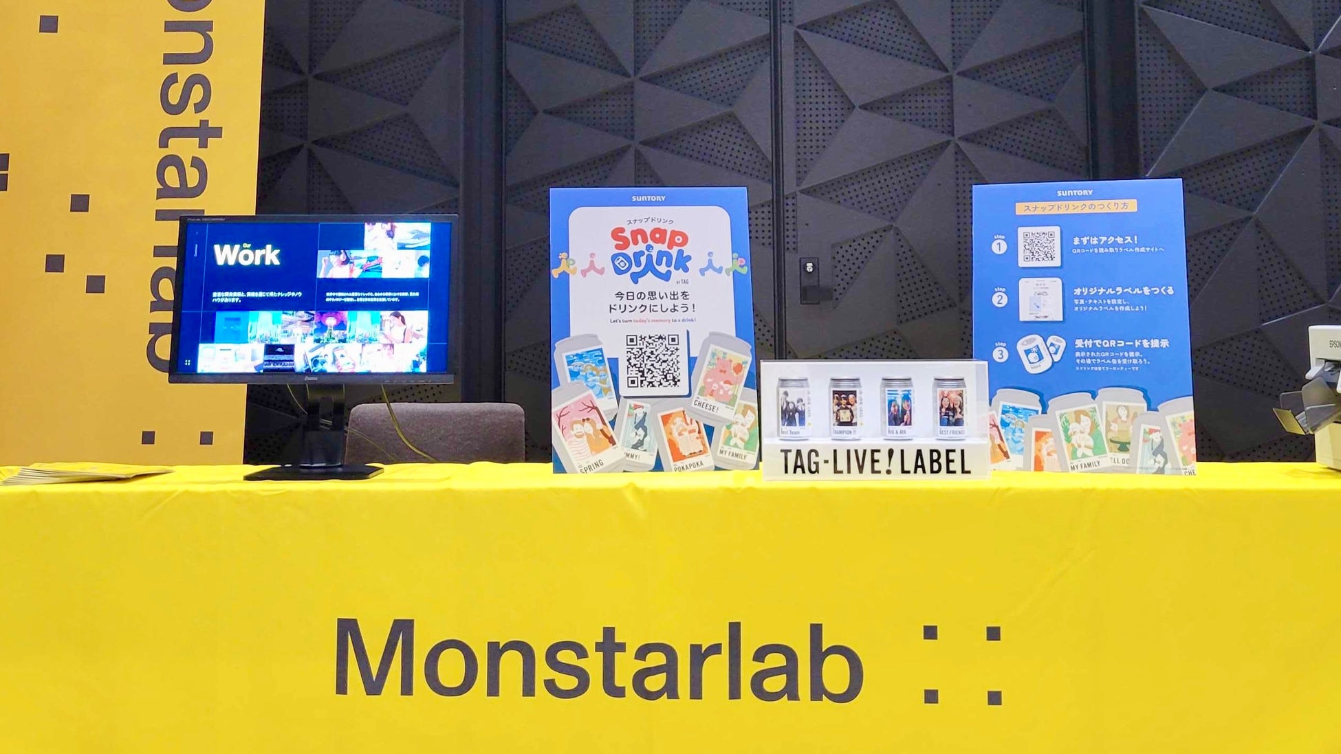 クライアントであるサントリー食品インターナショナル株式会社(※)の協力の元オリジナルラベルドリンク『TAG LIVE LABEL』の実機を活用した当社支援実績の展示を行いました。