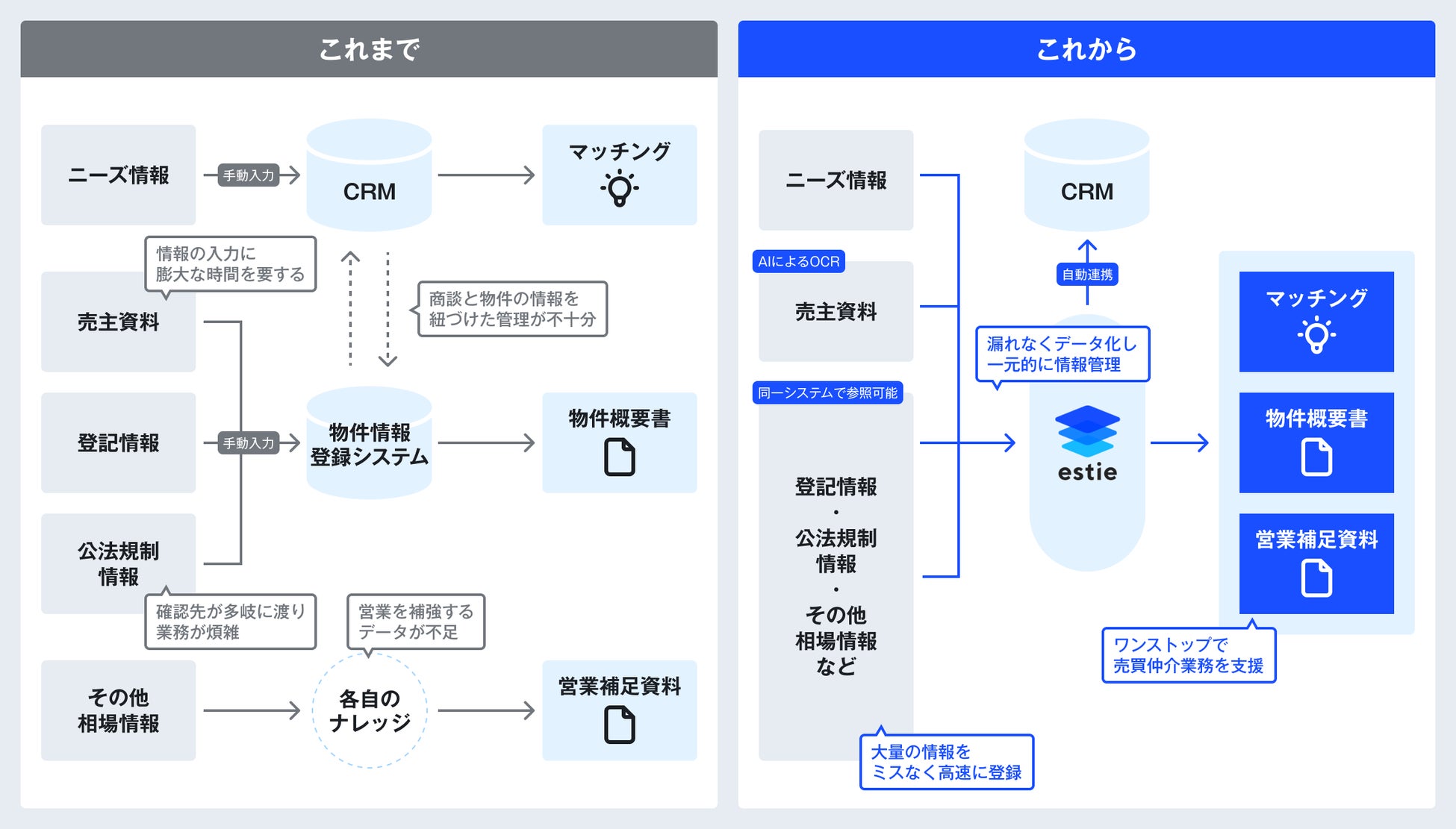 これらの課題に対応するため、estieが提供するデータ分析技術とデジタル基盤を活用し、物件データと顧客情報を統合的に管理・活用できる環境の整備を進めます。