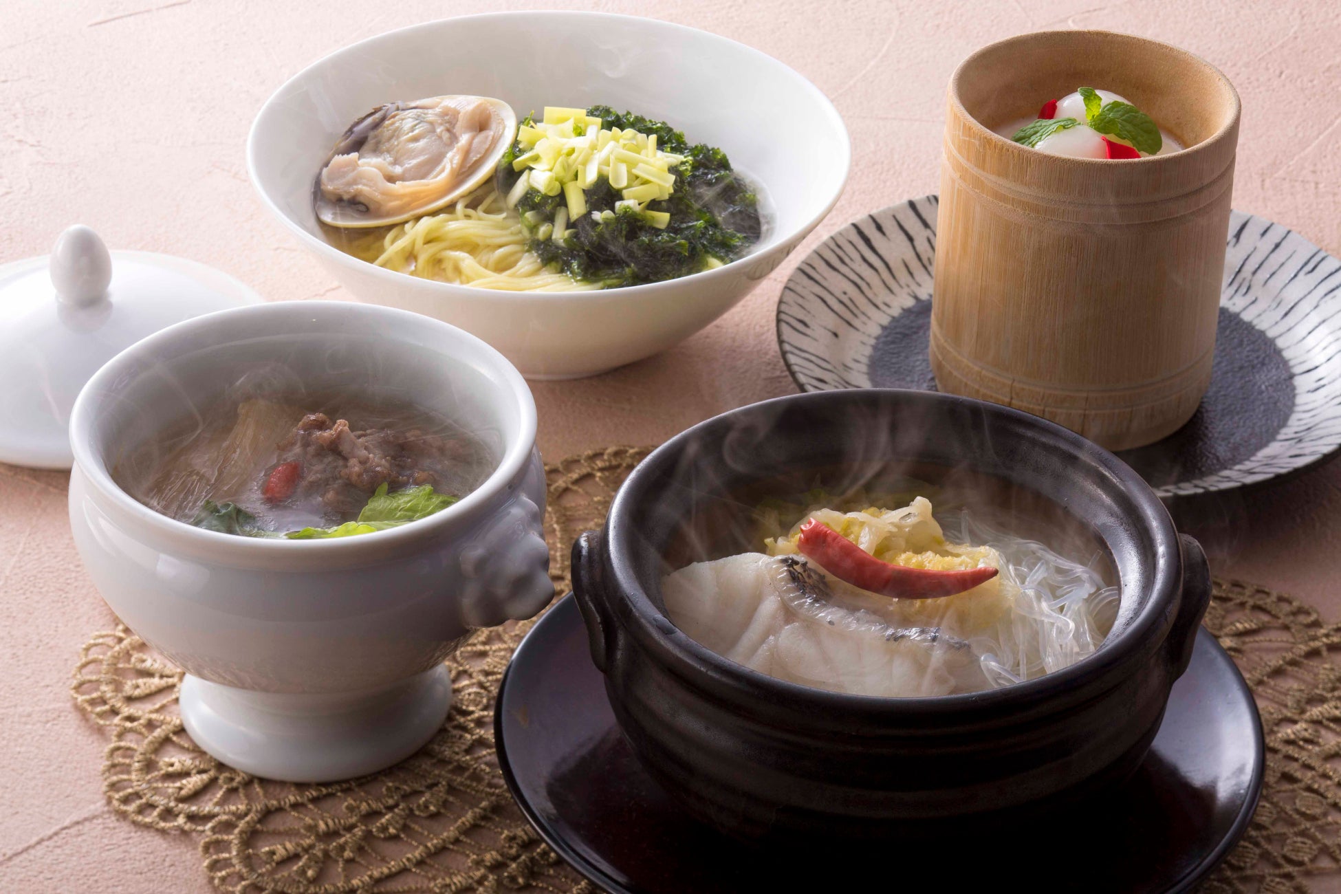 ふかひれ塊や牛バラ肉入りスチームスープ、ぷりぷりのクエを中国漬物や春雨と合わせた土鍋煮込みなど、湯気立つあったかメニューが続々と登場。蛤とあおさ入りのあっさり上品な麺で締めた後は、白玉団子入り甘酒スープデザートでほっこりと。