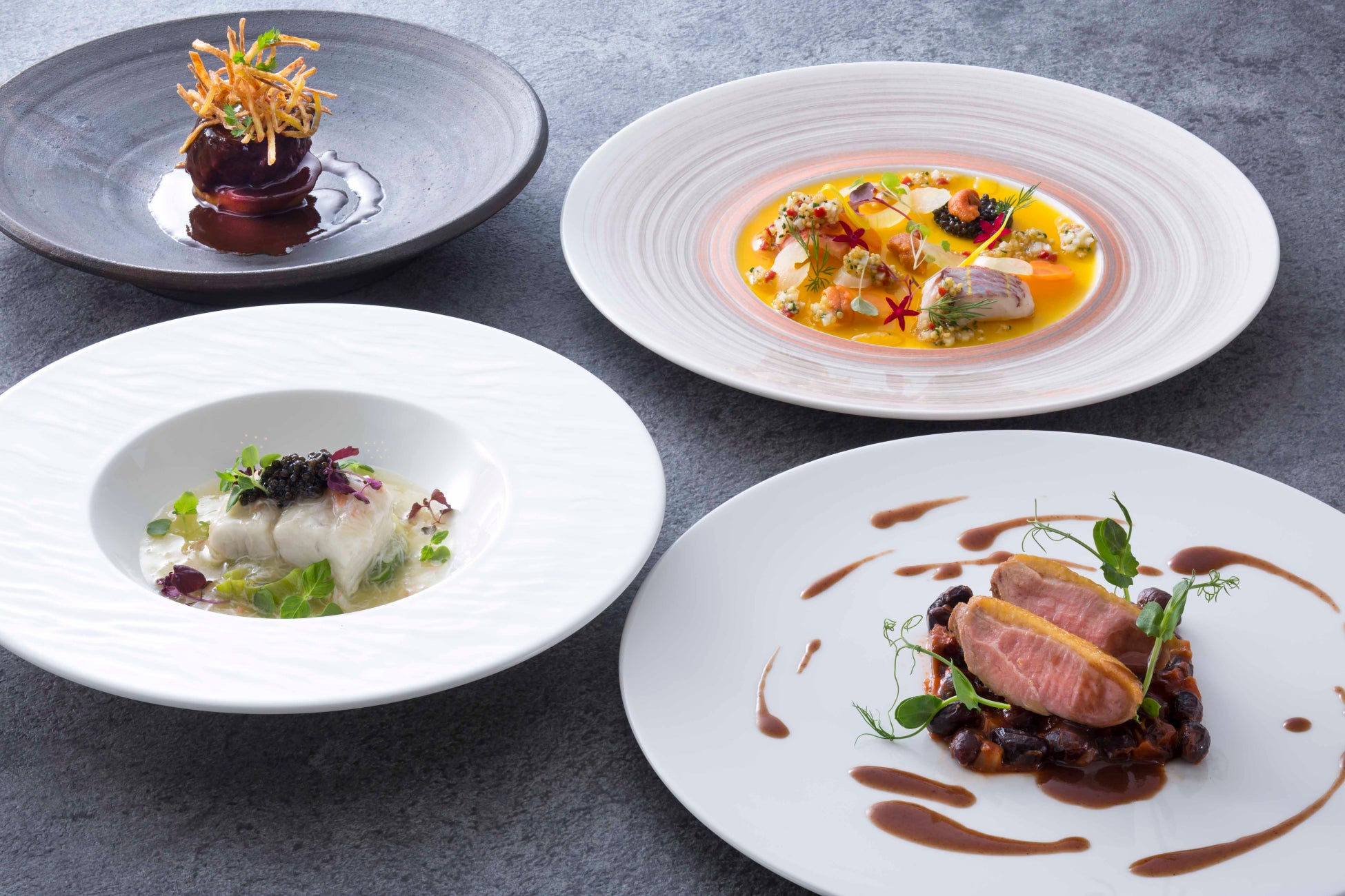 鍋料理をイメージして華やかなフレンチの皿に。彩り鮮やかなブイヤベース風前菜に続き、牛肉の赤ワイン煮込み、魚介鍋のイメージで香住産紅ズワイ蟹や岩津葱と合わせた旬魚の蒸し焼き、黒豆入りカスレを添えた鴨ローストなどが登場します。