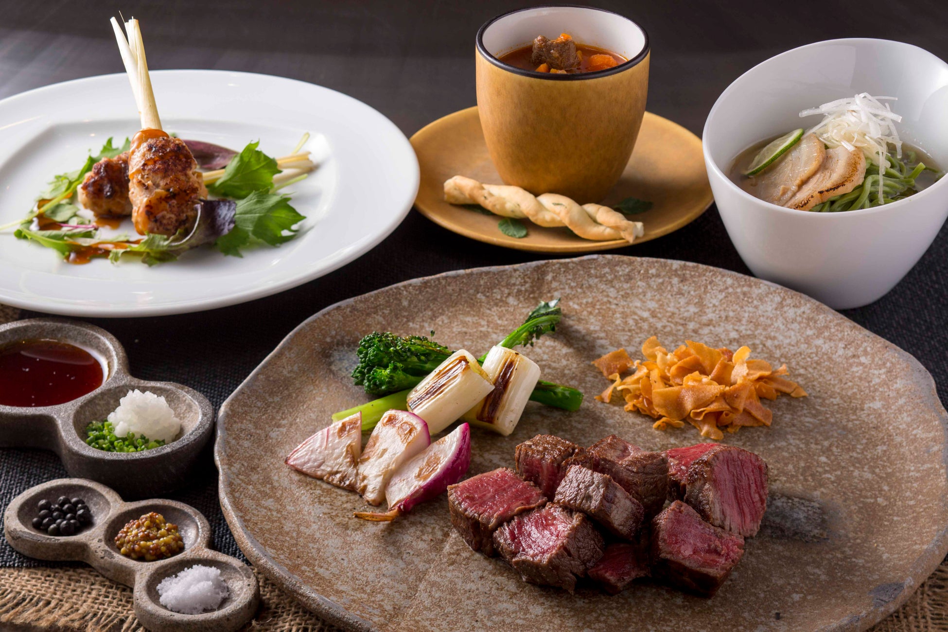 兵庫県産の鹿肉と野菜のミネストローネや、播州百日どりのシシケバブなど独創性豊かな温メニューに続き、メインは旨み溢れる黒毛和牛ステーキを。締めは鉄板で炊き上げる香住蟹の混ぜご飯か、神戸ポークチャーシュー入りわかめ麺から選んで。