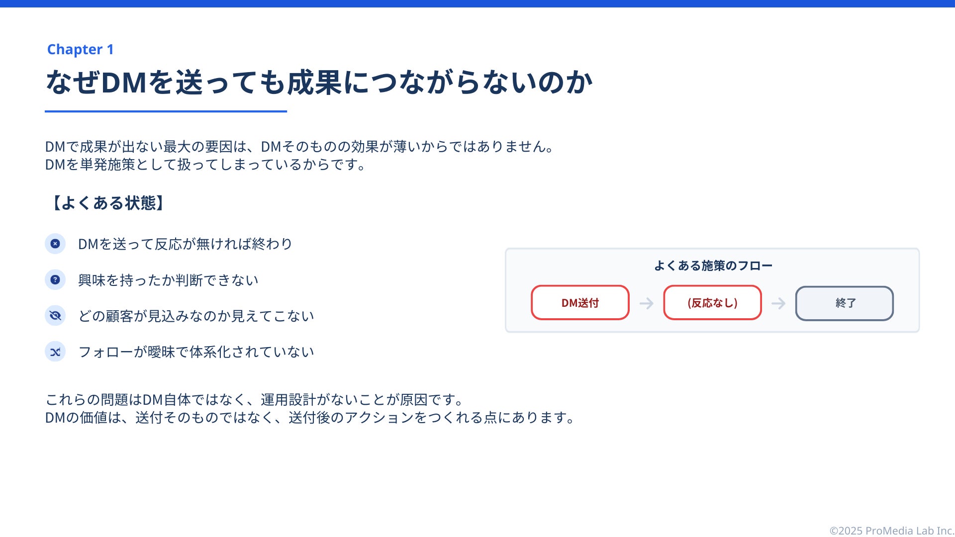 株式会社プロメディアラボ(本社:東京都中央区、代表取締役:廣瀬義憲)は、DM施策の成果を高めるためのフォロー設計を体系化した資料『DMを送るだけでは、商談は生まれない。 ―DM送付後のフォロー設計が成果を分ける―』 を公開しました。