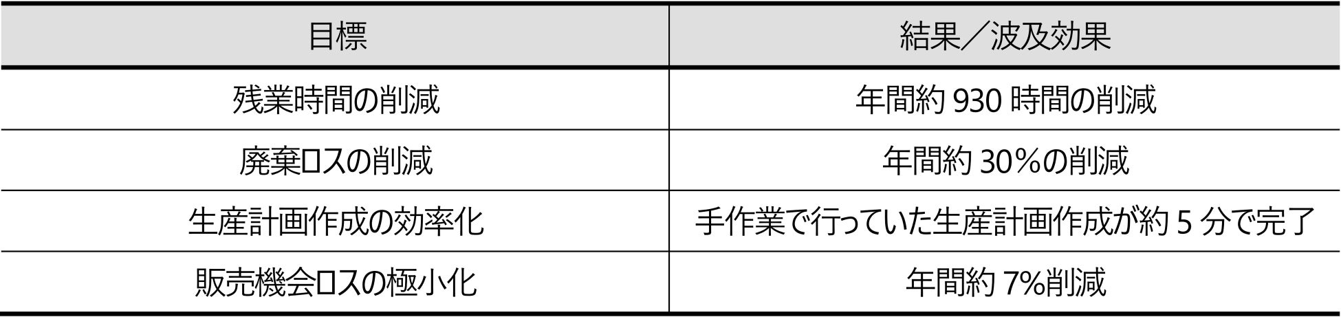 サプライチェーン全体では、某スーパーマーケットは年間売り上げが約7,000万円の増加、PB(プライベートブランド)日配品*4製造会社は、約6,000万円の増加となりました。生産計画最適化によって確保された生産余力は販売機会ロス分を補填し、生産および販売活動全般にわたるパフォーマンス向上が期待できます。