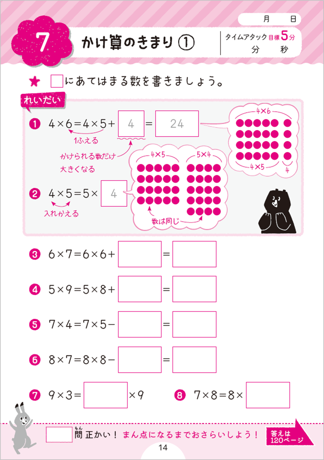 漢字も計算も1頁を目標5分の「タイムアタック」で解く練習をします。巻末の「学習の記録」には、正答数だけでなく、解くためにかかった時間を記入することで、実力がアップしたかどうかを一目で確認することができます。