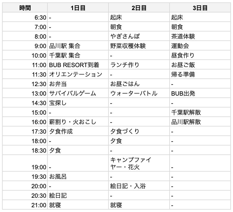 日本有数のアクティビティ量を誇るBUB RESORT内での体験に加え、施設を飛び出して、普段の宿泊では行うことのできない体験も行います。全てがハイライトで、安全で楽しい!BUBでしかできない学びの"きっかけ"となるような1日を我々と過ごしてみましょう!