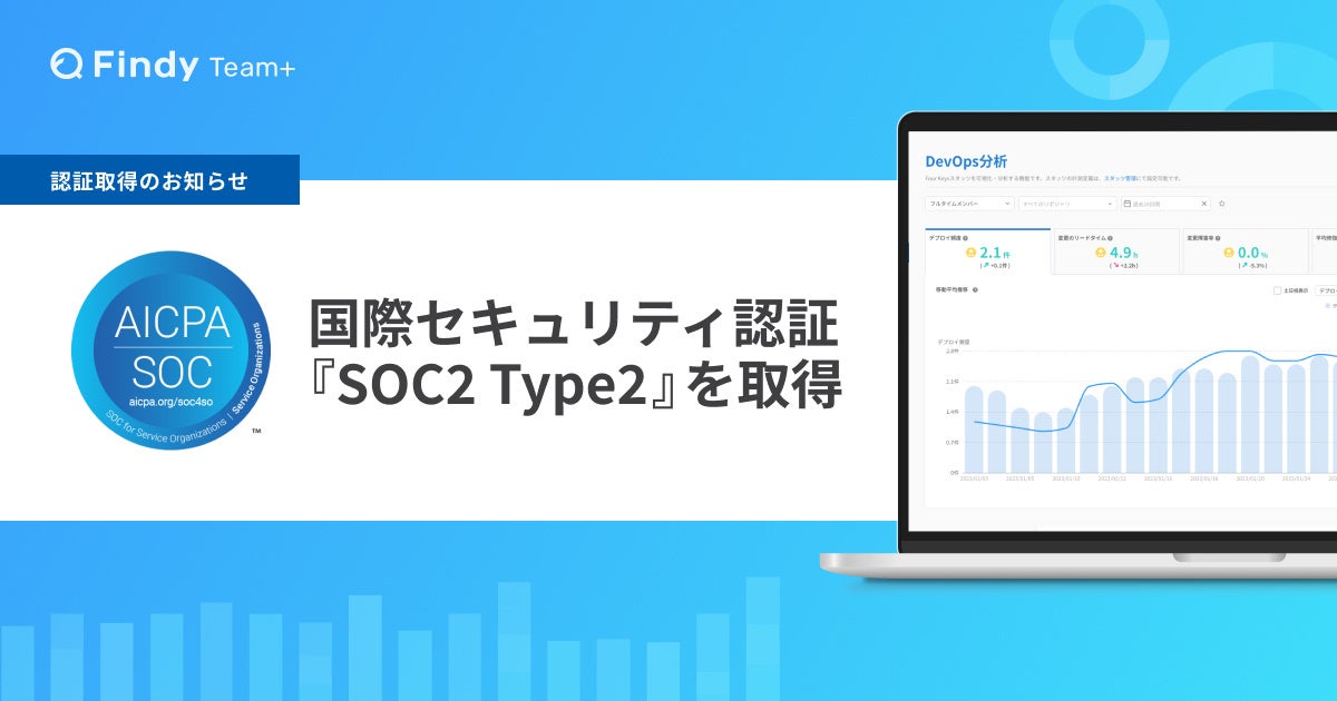 エンジニアプラットフォームを提供するファインディ株式会社(東京都品川区、代表取締役:山田 裕一朗、以下「当社」)は、エンジニア組織の開発生産性可視化・向上SaaS「Findy Team+」が内部統制の国際セキュリティ認証である「SOC2(Service Organization Control Type 2)」において、「Type2保証報告書」を受領したことを発表いたします。
