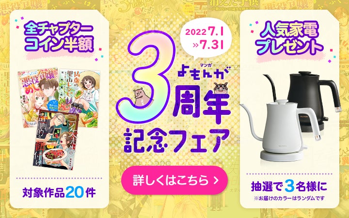 いつもマンガを楽しんでくださるみなさまのおかげで、スマホ向けコミックサイト「マンガよもんが」は7月1日で3周年を迎えました。