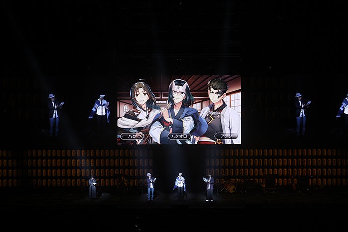 続いてステージに現れたのは、小山剛志さん、柚木涼香さん、Suaraさん。小山剛志さんの「横浜BUNTAIのみなさ〜ん、うたわれるものですよ〜 」という声と共に、「真・うたわれるもののテーマ」の時間が始まりました。観客からの合いの手もバッチリで大盛り上がりのなか、歌詞にも登場している浪川大輔さんがサプライズ登場し、30周年の節目でついに同曲を小山剛志さんと一緒に歌い上げることとなりました。