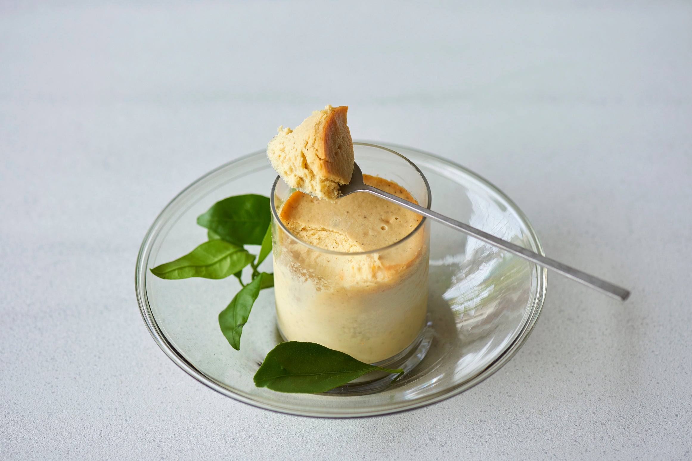 オレンジは甘く爽やかな香りとビターで苦味のある香りに分けられ、果汁や果肉からは甘く爽やかな香りと味わい、果皮からはビターで苦味のある味わいを感じられます。この2つの特長を活かすために、ネロリというビターオレンジや柑橘系の香りを持つジャスミン茶の香りを加え、オレンジとジャスミン茶を自然に繋げ、切れ目のない抑揚と奥行きを生み出しました。また、サワークリームとレモン果汁で酸味や旨味を引き立てることで、ケーキ全体からオレンジの甘く爽やかな香りをお楽しみいただけます。