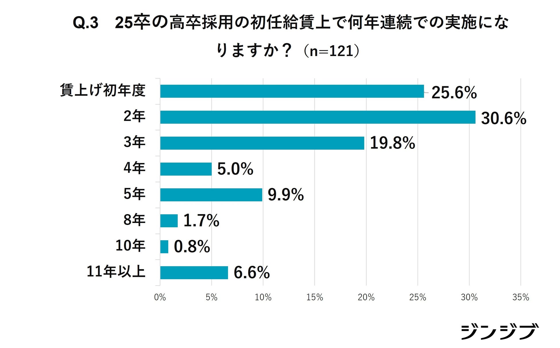 25卒の高卒の初任給賃上げの連続年数を質問したところ、回答があった中で、「2年連続」(30.6%)が最も多く、次いで「初年度」(25.6%)、「3年連続」(19.8%)と続きます。アフターコロナで求人数の回復傾向が見られた23年卒から賃上げを実施している傾向が見て取れます。