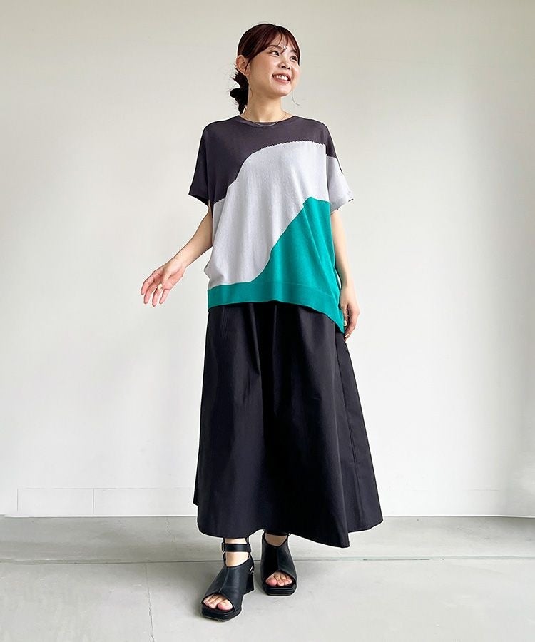 流れるような切り替えの3配色のデザインが印象的なトップスをメインにコーディネートしました。配色デザインを目立たせるようにスカートやサンダルは黒で統一。落ち着いた印象の中にも、グリーンがワンポイントになります。
