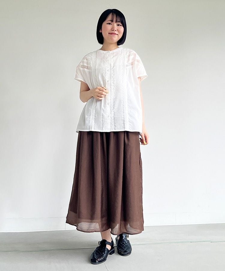 白のコットンブラウスにシアースカーチョを合わせた、ナチュラルなスタイル。ブラウスには、ピンタックやレースの繊細なデザインが施されており、女性らしくフェミニンな印象に仕立ててくれます。