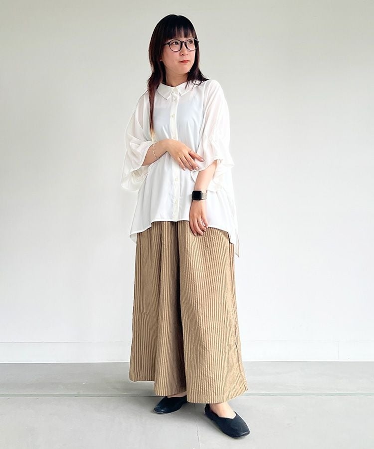 落ち感のあるシャツはラフで女性らしい印象に。ボトムスには、細めのストライプデザインできれいめな印象もありつつ、シルエットはワイドでラフなパンツを合わせました。ぽこぽことした生地がナチュラル感を演出します。