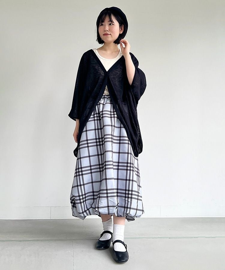 透かし編みカーディガンとサーモ素材のベレー帽でナチュラルな雰囲気に。スカートのチェック柄やバルーンシルエットがフェミニンさをプラスし、甘すぎない大人のかわいらしさを演出します。