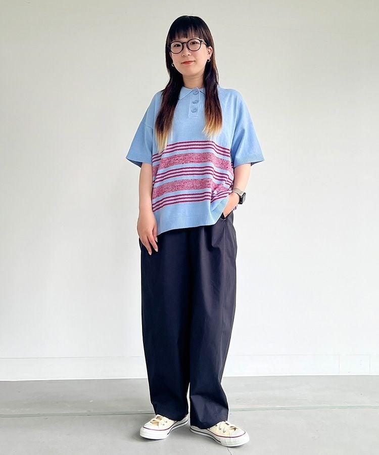 トレンドのマニッシュなラインデザインポロシャツと、ラフなイージーパンツを合わせたボーイッシュスタイル。抜け感がありつつも、ラフさとお洒落さを兼ね備え、普段使いにぴったりの着こなしです。