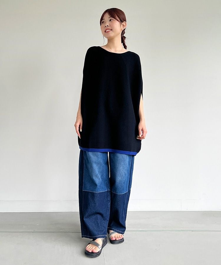 コクーンシルエットのトップスで大人の抜け感を演出。パキっとした配色の裾ラインがコーデのポイントになります。ボトムスには配色デザインが効いたデニムを合わせ、上下丸みのあるシルエットで、ラフでモードな印象にまとめました。