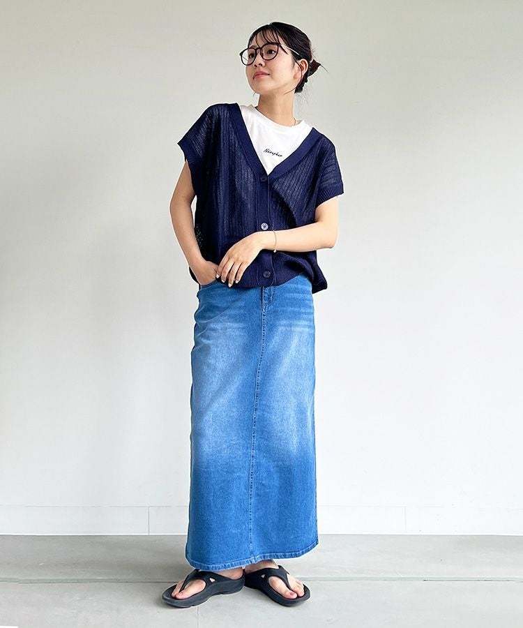 定番アイテムのデニムスカートを小さめロゴの白Tシャツと合わせることで、カジュアルになりすぎず華奢で女性らしいスタイリングに。さらに、透け感のあるニットジレをプラスすることで大人のこなれた印象に仕立てます。