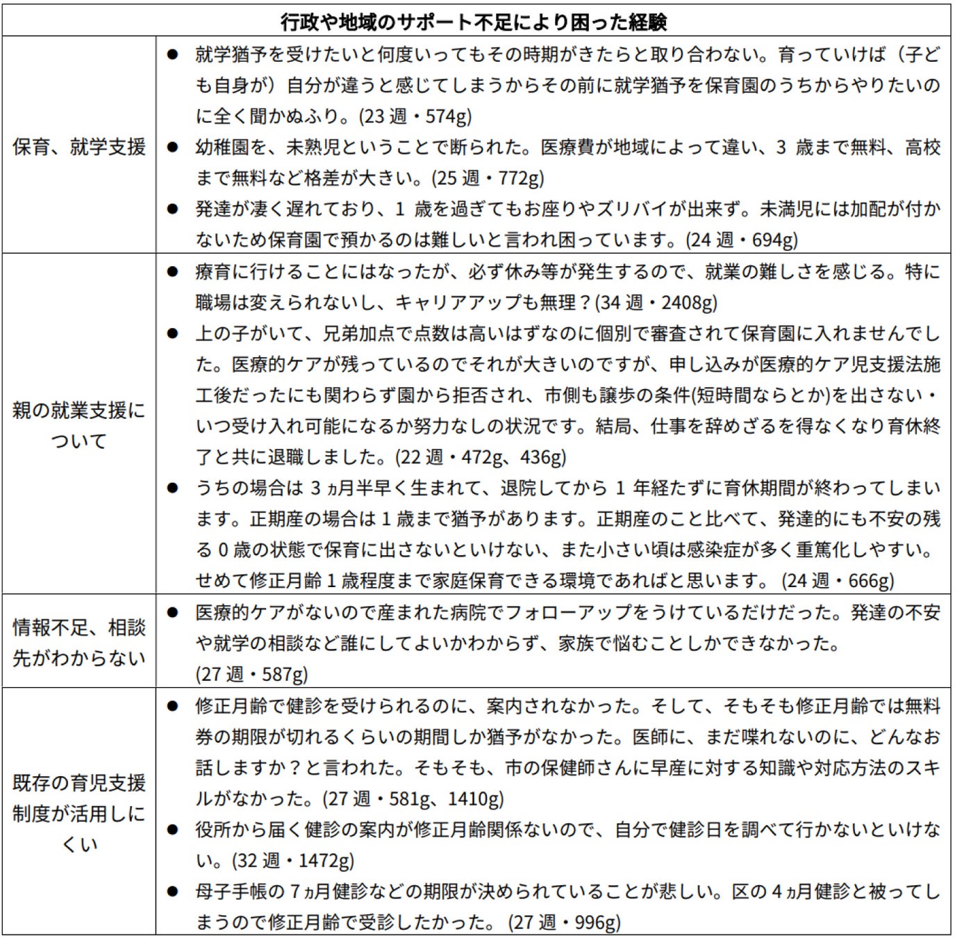具体的には、子どもの保育や就学についてや早産児ご家族の就業制度について、また育児支援制度がそれぞれの早産児の成長状況に柔軟に対応できていないといった状況、情報が少なくそもそもどこに相談したらいいのかが分からない等、支援を求める声が上がっています。