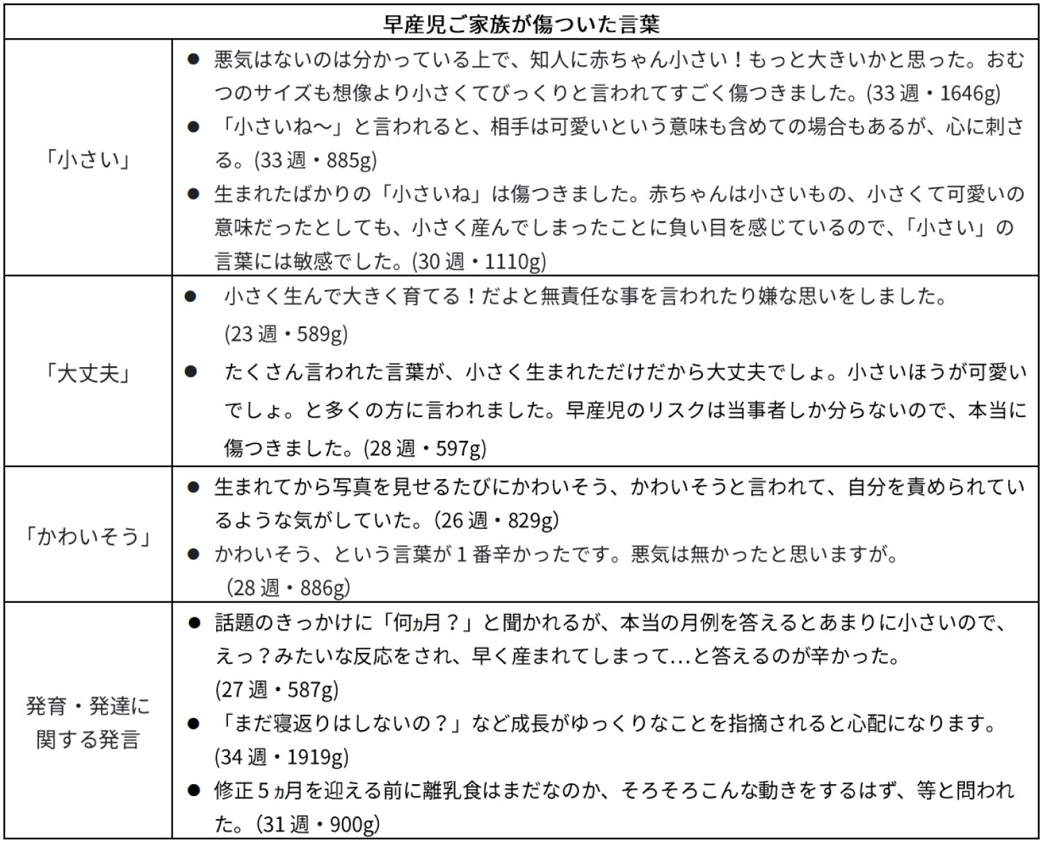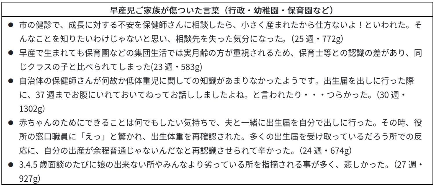さらに、各種手続きや支援の窓口となる自治体、子どもを預ける幼稚園や保育園においても、早産児とそのご家族への理解不足からくる発言や対応があったとのコメントも数多く見受けられました。