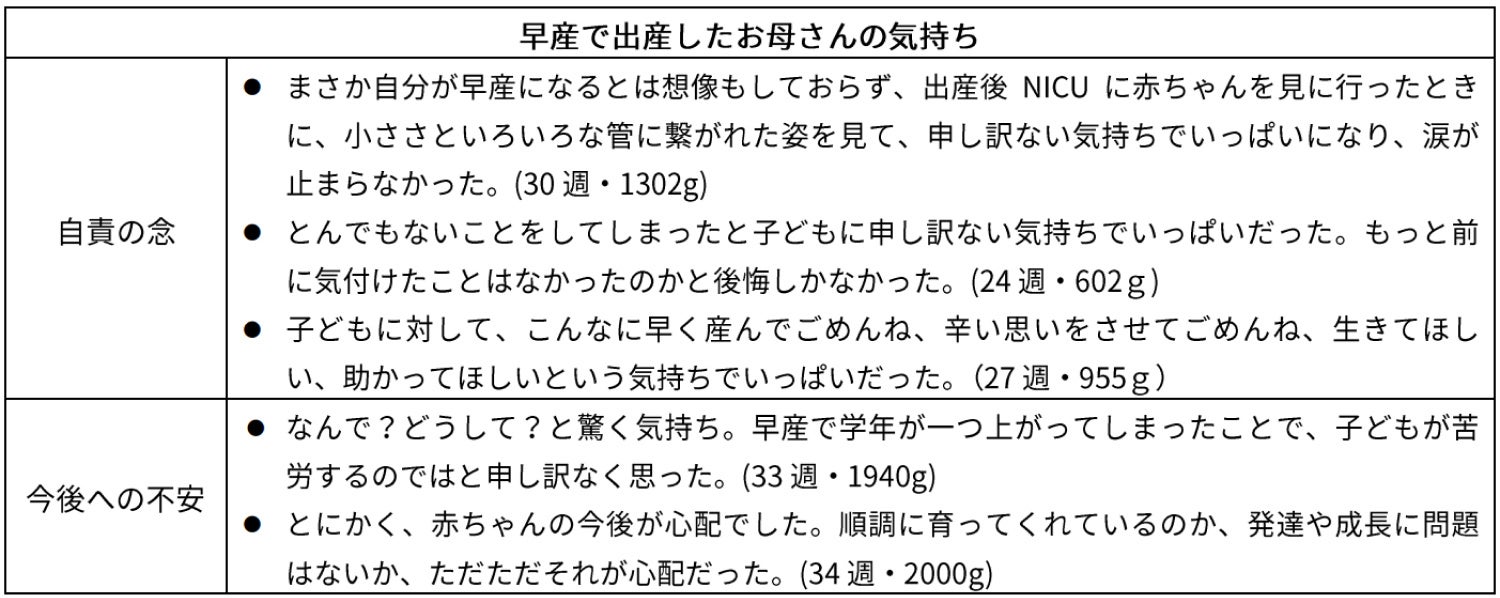 ●子どもが早産で生まれたことで不安や悩みを抱えている早産児ご家族は9割超。「自責の気持ち」と「今後への不安」が多く語られた。