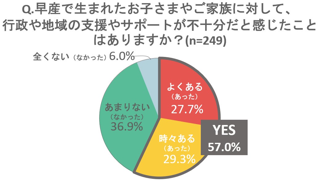 「早産児」に対する行政や地域のサポートについては、約6割の早産児ご家族が、何かしら不十分だと感じたことがあるという結果となりました。