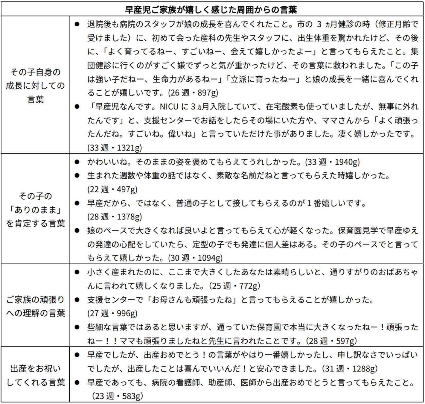 様々な場面で不安や傷つく経験もある早産児ご家族ですが、一方で周囲からの温かい言葉に支えられたといったことも多くの当事者ご家族が経験されていることが明らかになりました。特に、その子自身の成長を見て一緒に喜んでくれていると感じる言葉や、その子のありのままを肯定するような言葉、またご家族の頑張りへの理解・ねぎらいの言葉を嬉しく感じているご家族の声があがっています。