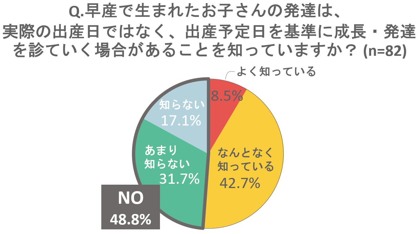 一方で、早産児の発育発達について、出産予定日を基準にすることがあることを知らない一般のご家族の割合は約半数という結果となり、早産の赤ちゃんの発育発達についての認知度は高いとはいえない状況です。