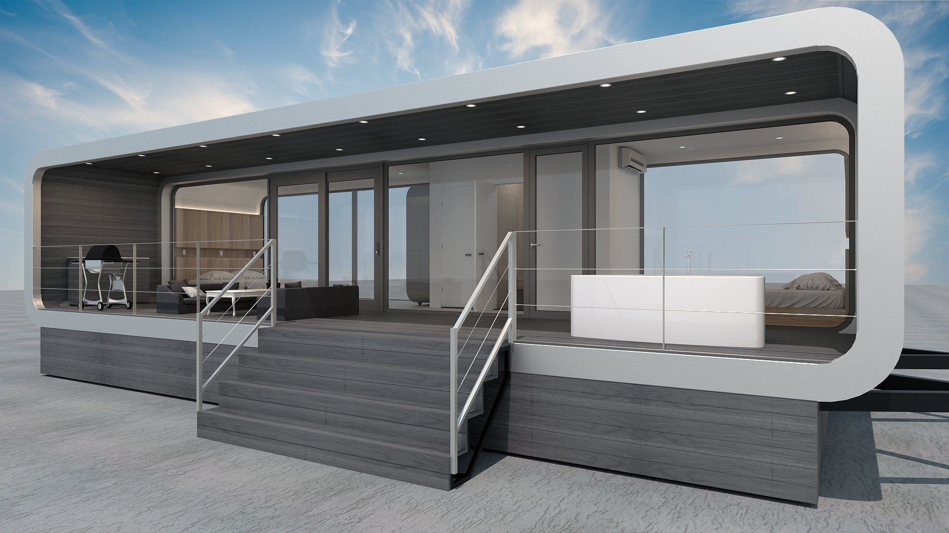 客室内は機能的でシンプル、プライベートデッキでは専用のバーデプール(※水着着用必須)を設え、「おもてなしBBQ」を楽しみ、非日常空間で時間の移ろいをご堪能いただけます。愛犬同伴宿泊も可能。