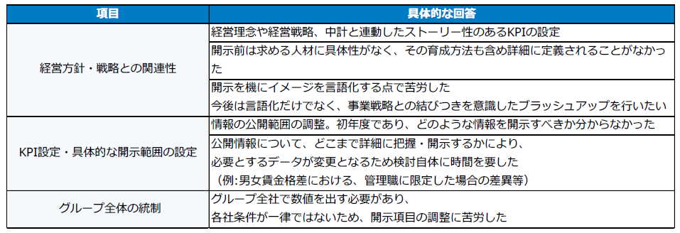 「KPI設定・具体的な開示範囲の設定」「グループ全体の統制」といった回答が寄せられた。