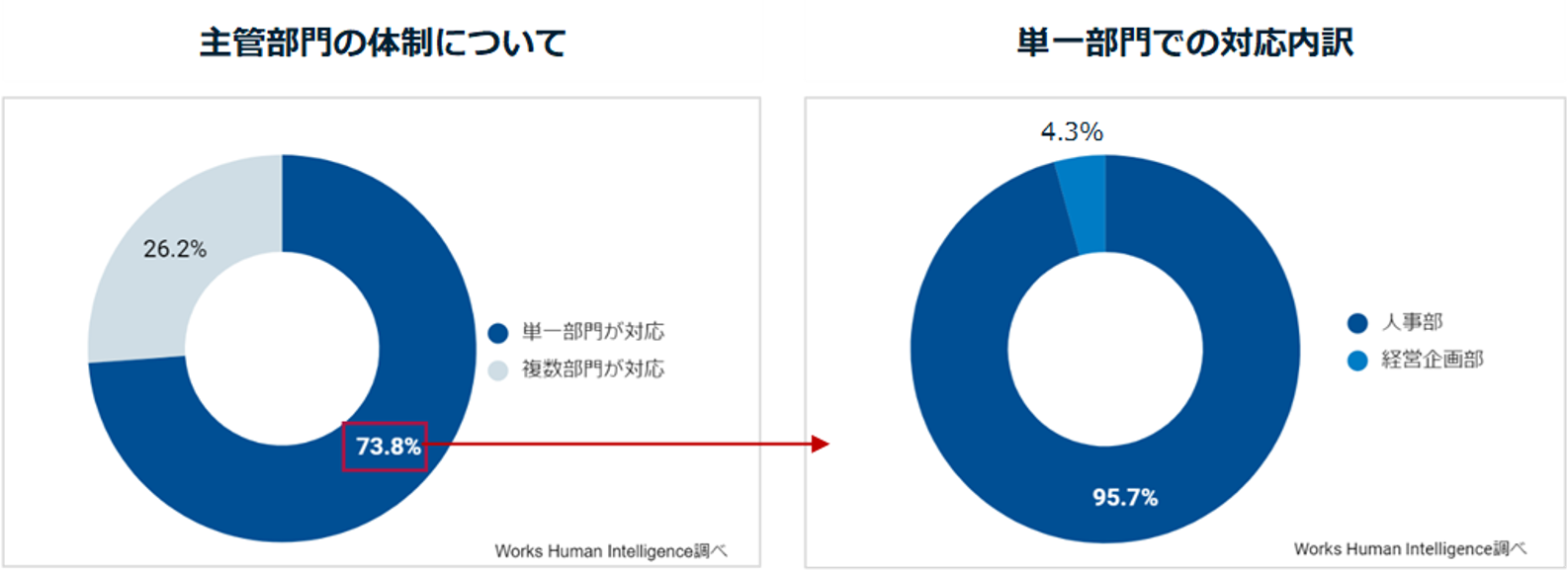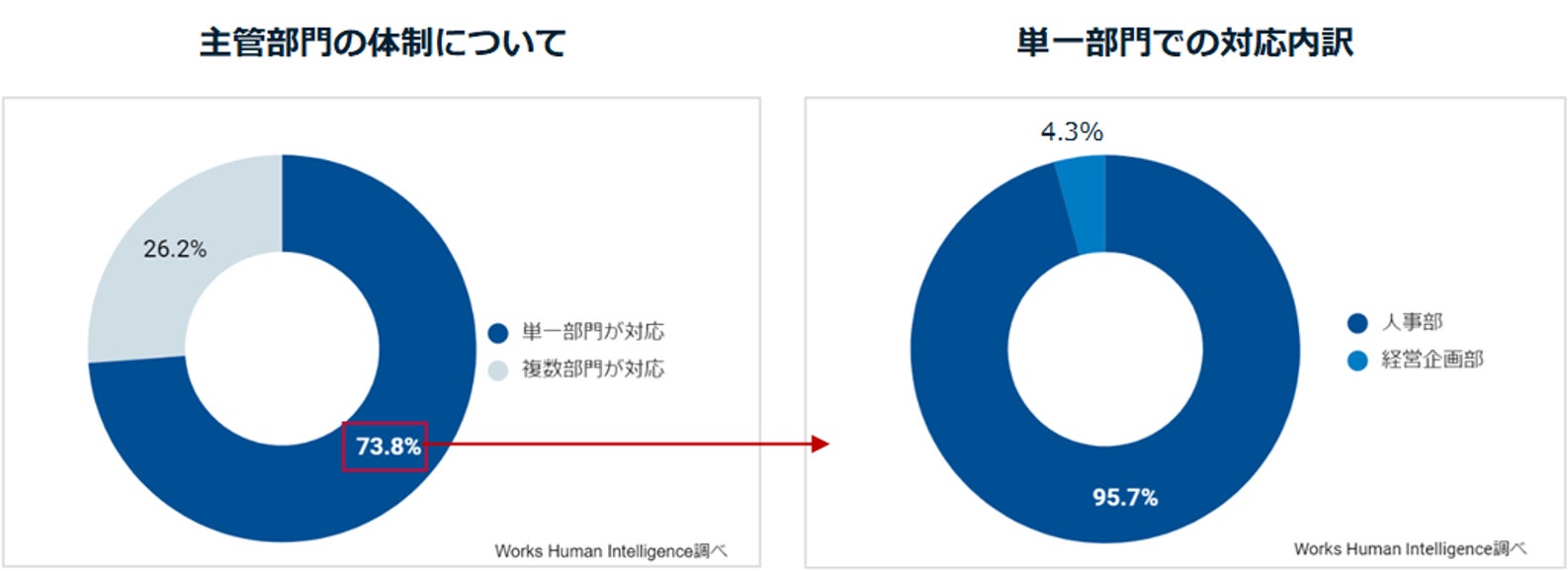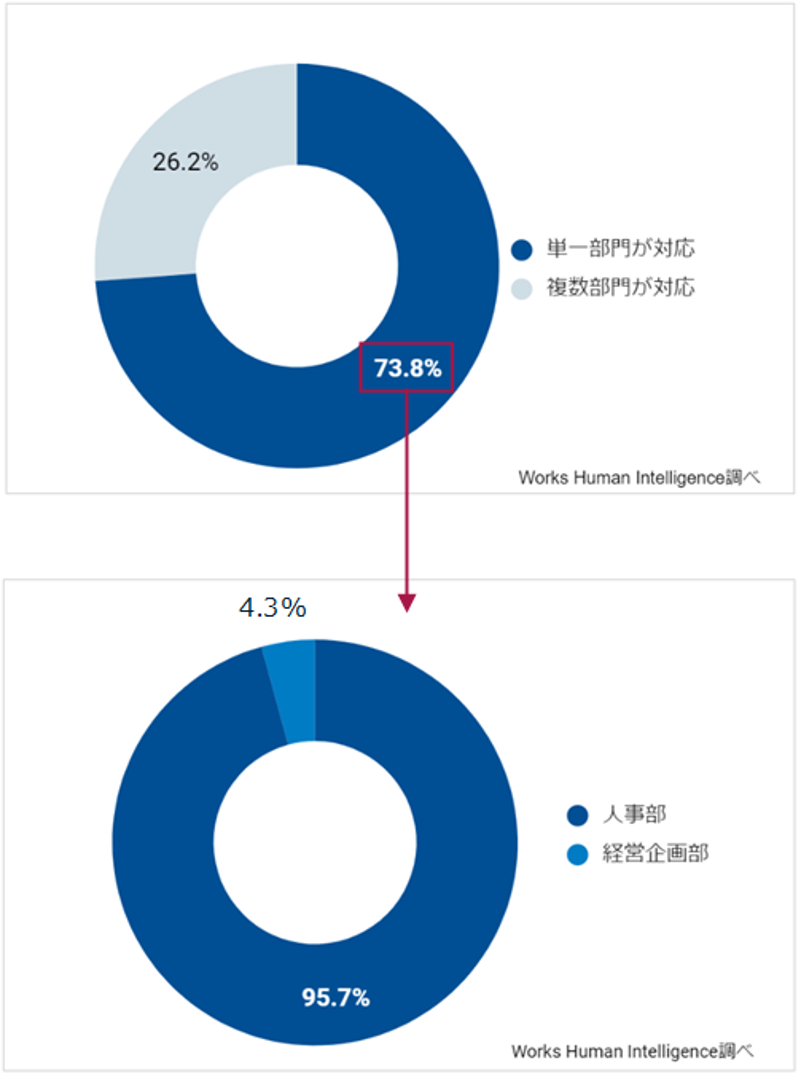 2. 人的資本開示対応において、専任担当者が「いなかった」企業は70.8%。開示対応を行なう部署について、「単独で行っている」企業が73.8%を占め、そのうち95.7%が「人事部」で対応していると回答。