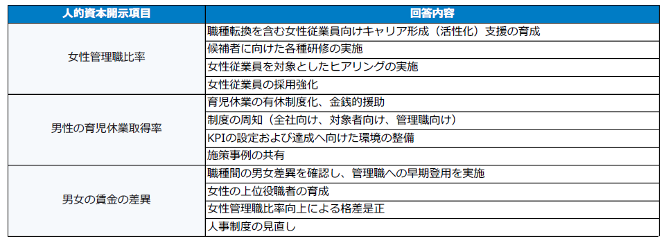 「男女間賃金差異」の一因である、女性管理職の低比率を解消すべく、まずは「女性管理職比率」の向上に注力するといった回答が複数見受けられ、段階を踏んで自社に合った施策を推進している状況が明らかになりました。