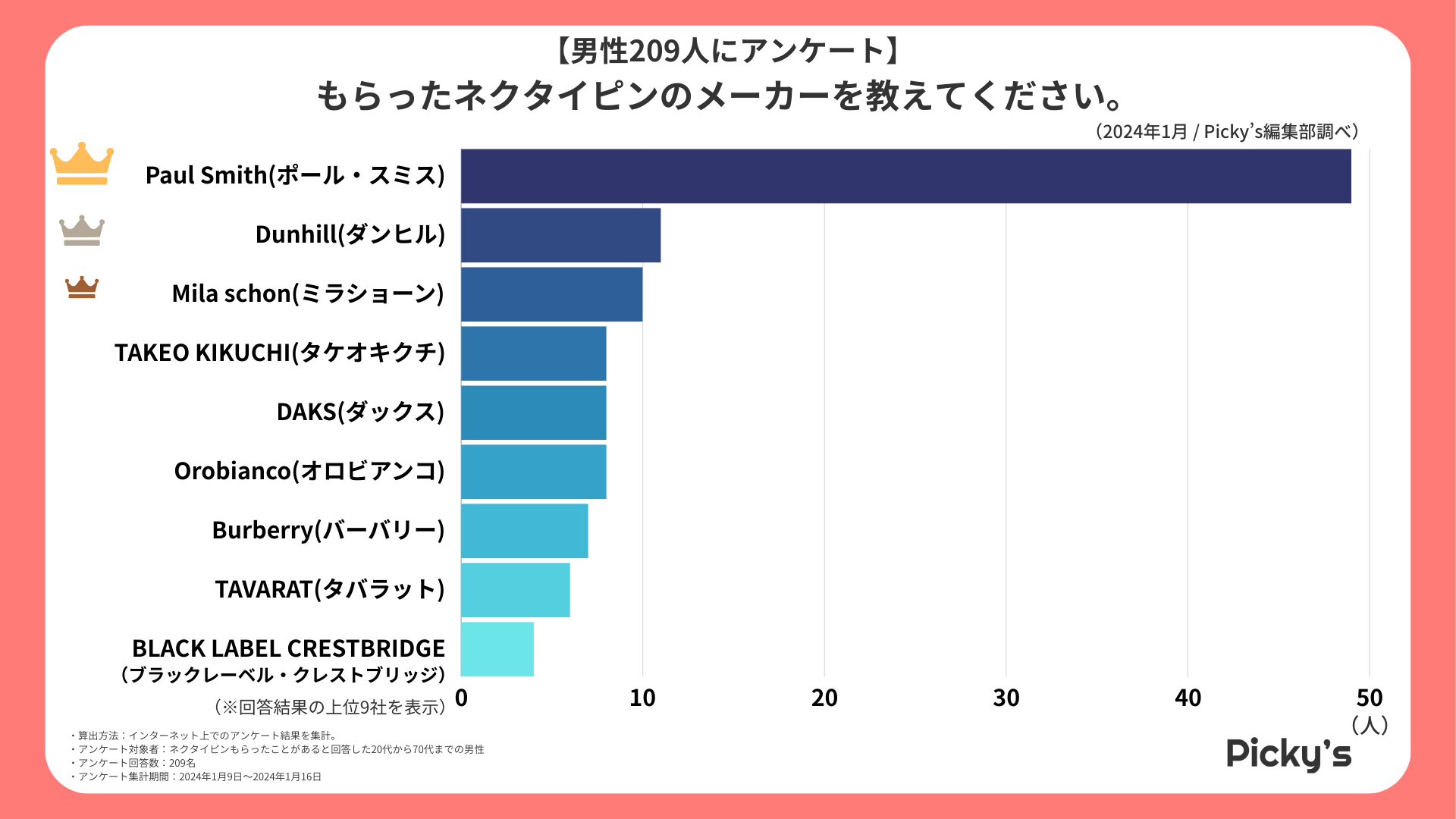 「Paul Smith(ポール・スミス)」のネクタイピンがいちばん多く回答があがりました。