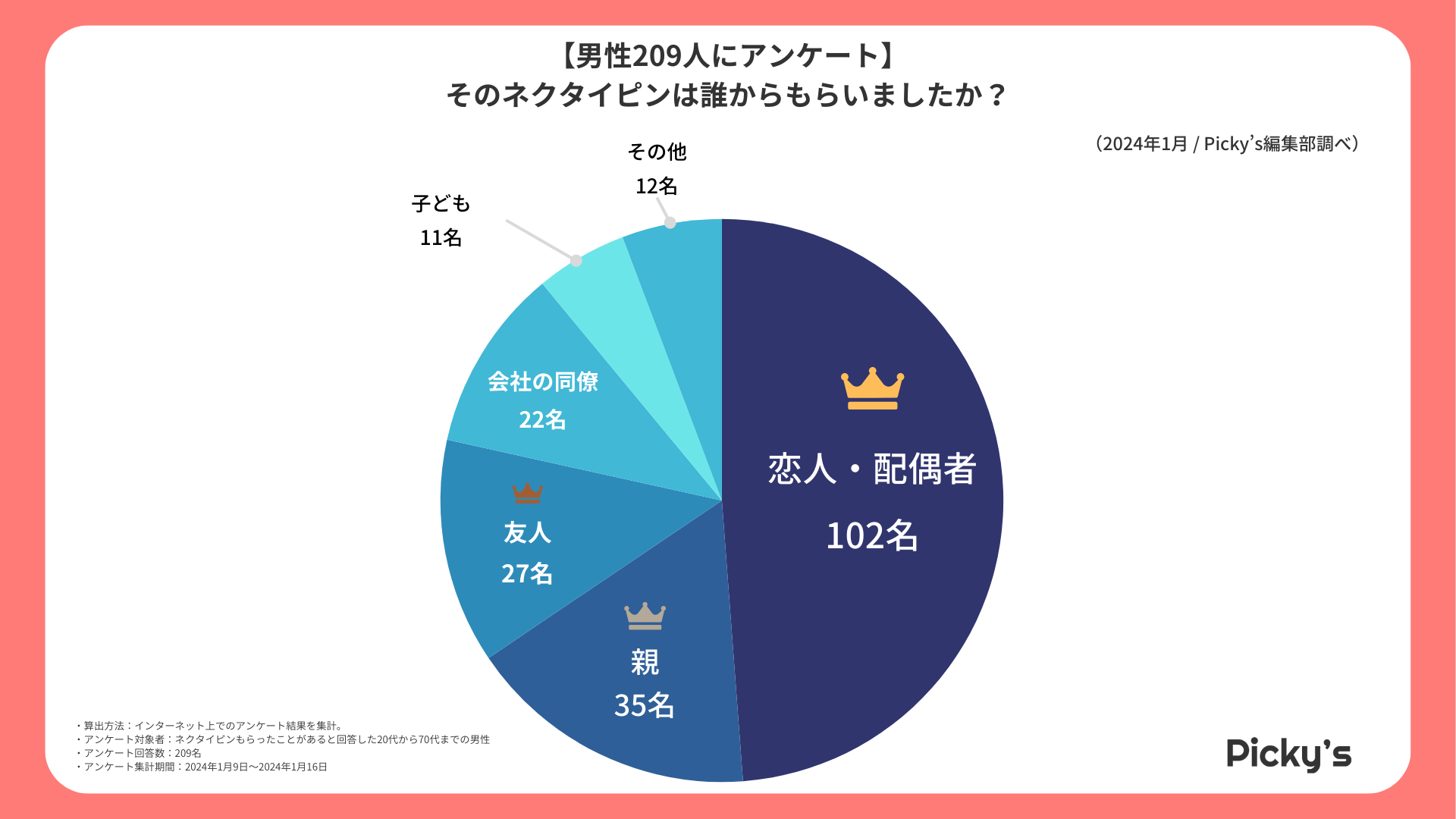 全体の約半数の方が、「恋人・配偶者」からネクタイピンのプレゼントをいただいたという結果となりました。